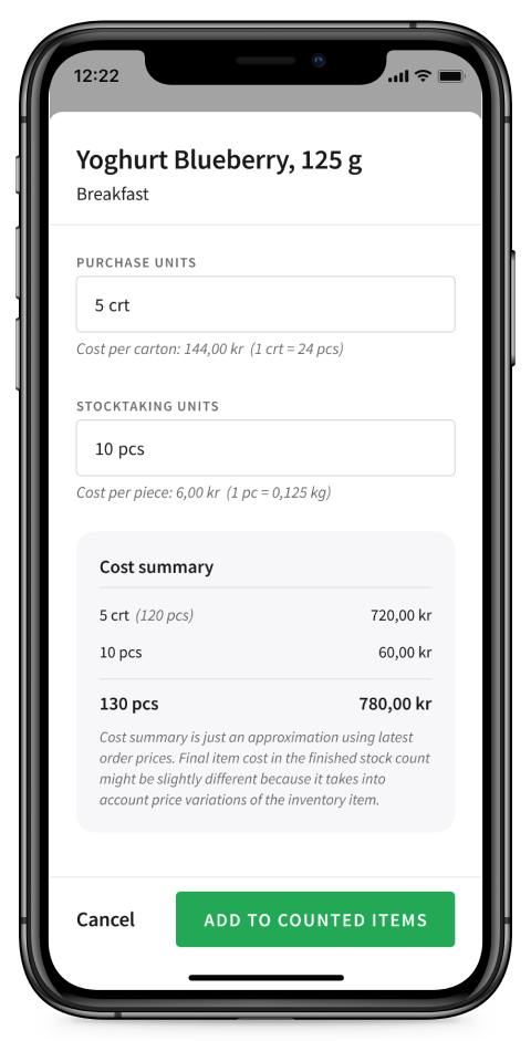 Units were the harder problem. Staff might count a full carton, loose packages, and individual items in the same session. We supported three unit layers - base, purchase, and stocktaking - each carrying its own cost, so the system absorbed the messiness of physical storage rather than forcing mental conversion before entry. Resolving cost per unit at input prevented downstream reconciliation errors where the same ingredient appeared at conflicting values.